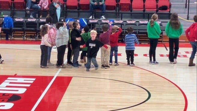 That is Thomas hamming it up front and center. He ran onto the court and lined up with his classmates and got recognized for perfect attendance during halftime at a Gardner-Webb men’s basketball game. Gardner-Webb partners with local elementary schools, giving kids a free ticket who have perfect attendance for the month. It was Thomas’s first game in a “basketball stadium,” as he calls it, and he watched the game enthusiastically, leading cheers of “defense,” often when Gardner Webb had the ball—we’re still working on game fundamentals.